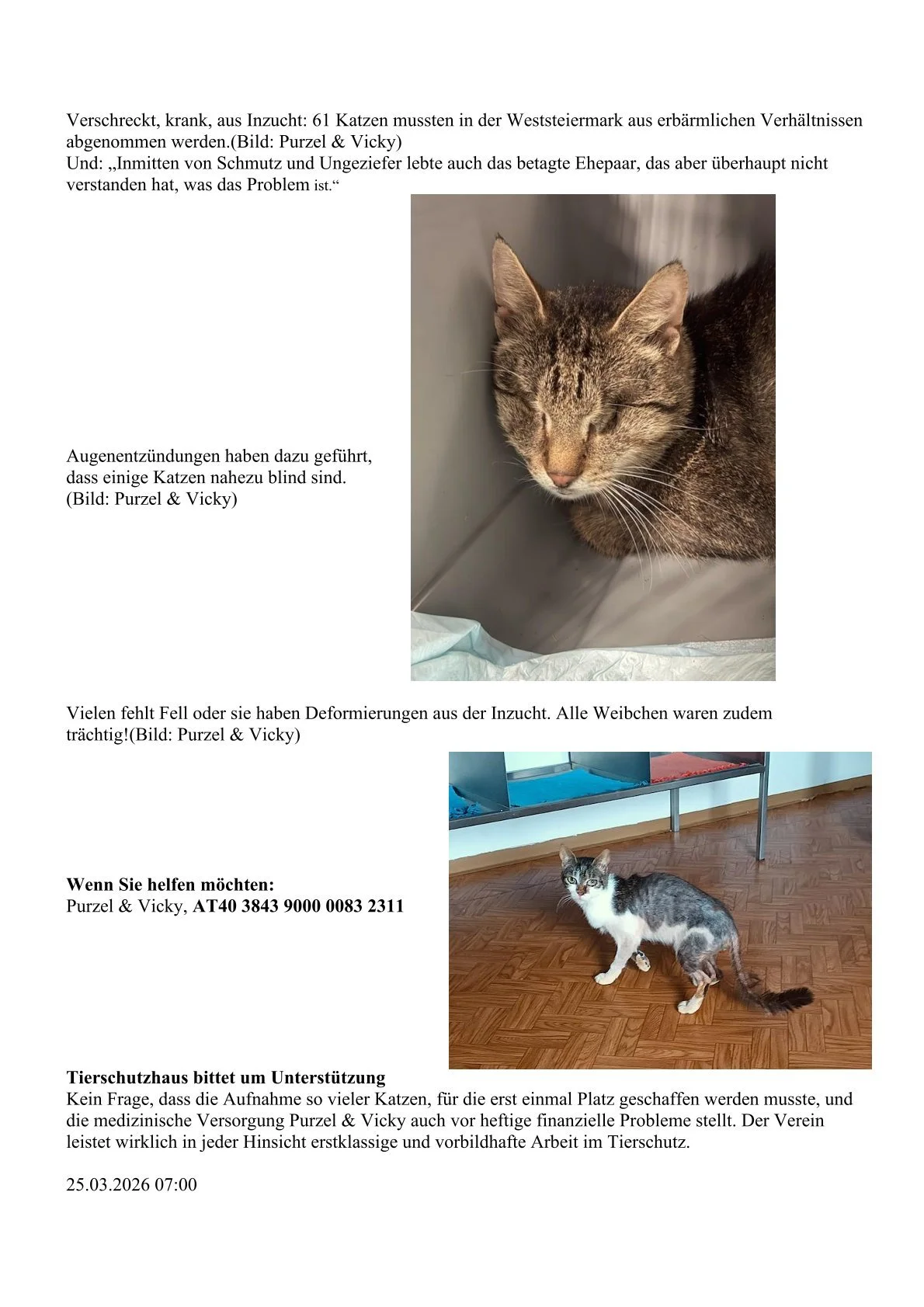61 Katzen gerettet 25. März Verfasst von Purzel Vicky https://www.krone.at/4087838?fbclid=IwY2xjawQwmxNleHRuA2FlbQIxMQBzcnRjBmFwcF9pZBAyMjIwMzkxNzg4MjAwODkyAAEejouhjNHm5SrXdmX5doiJqEi_cp4xr582FopQnnH-J3T6I-bsx0jeMpHWo7o_aem_tZ0aEKGzTb70X6pTfXqa8A Kronen Zeitung, 26.3.2026 Purzel Vicky